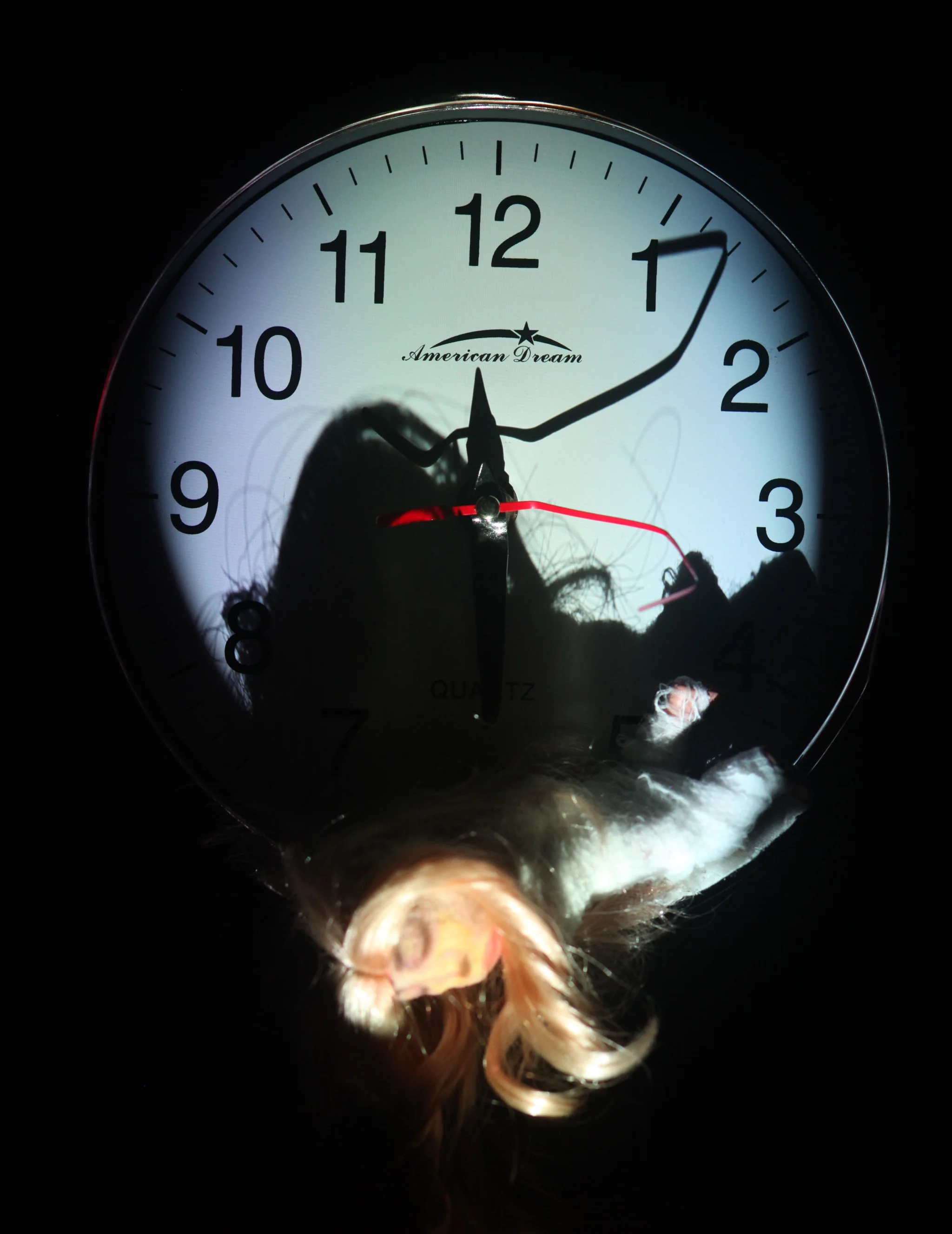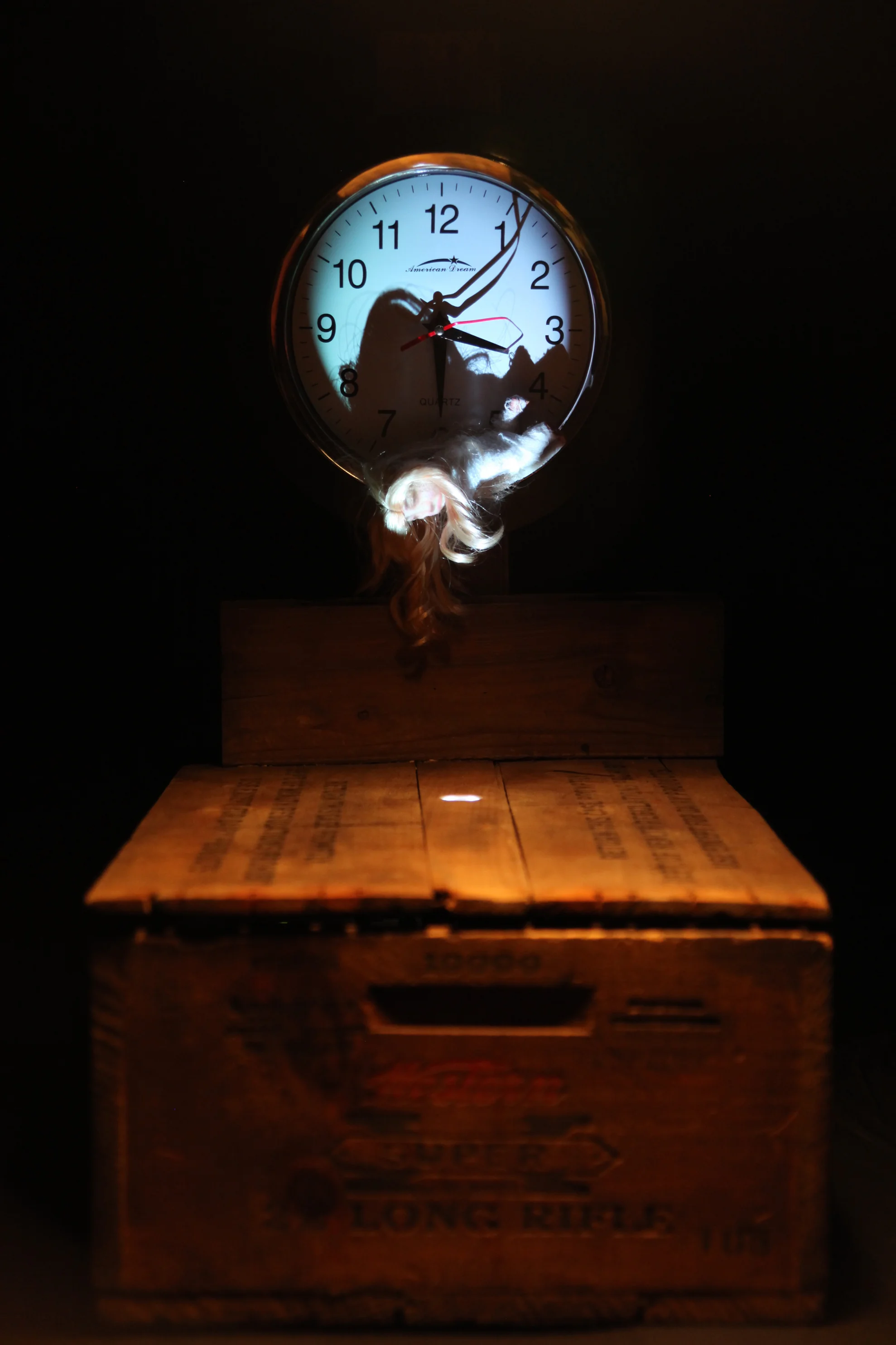 American Dream consists of a running/broken clock, found and prohibited materials, a miniature figure wrapped in medical gauze, and projection emanating from a hole within the assembled case. The figure laughs endlessly. American Dream is a series of multimedia sculptures within the Rec Room series. American Dream Number One (shown here) is 14.5" x 12" x 34" (2011).