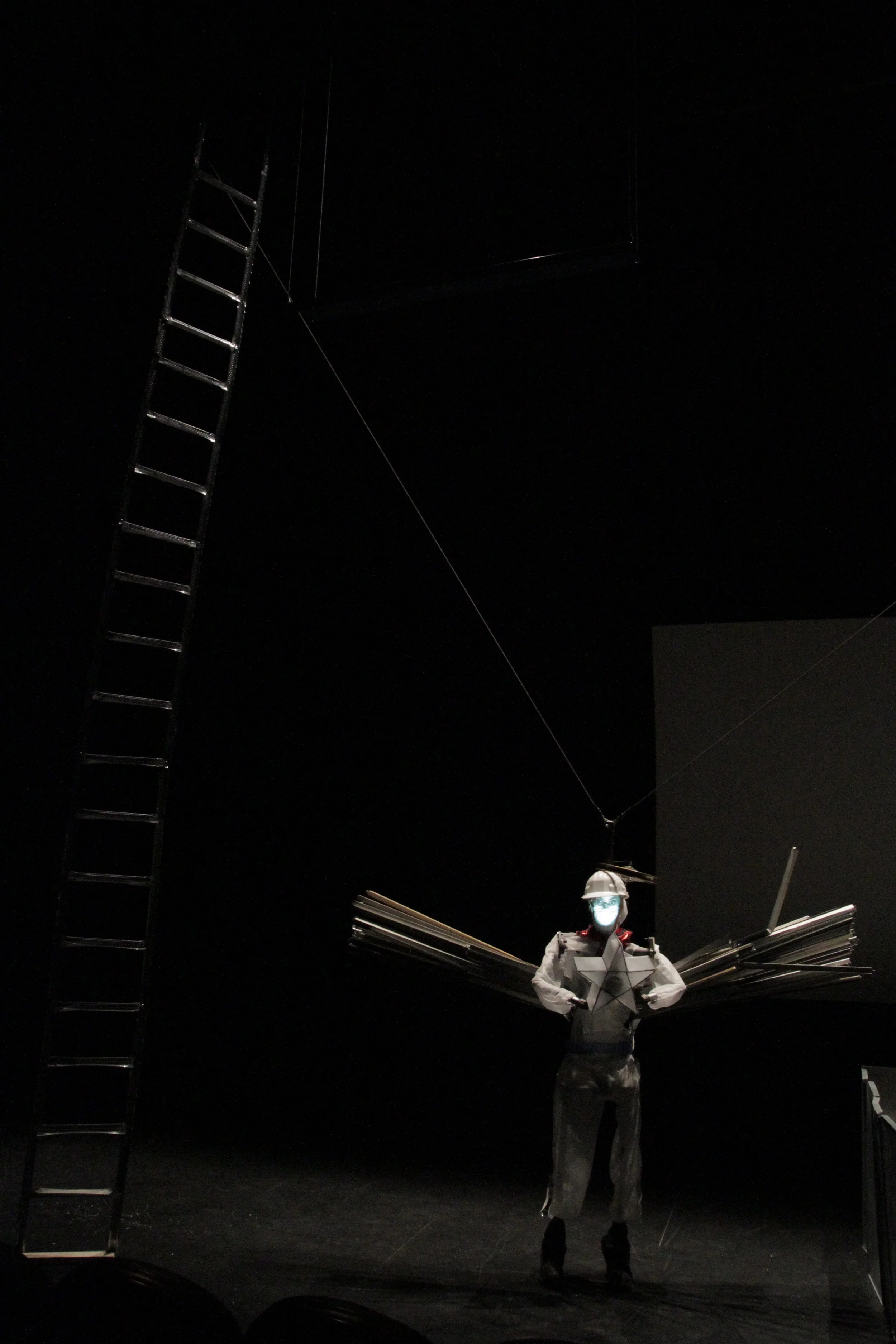 The Ball Pit first exhibited as part of Untitled Apocalypse at The Experimental Media and Performing Arts Center (EMPAC). A life-sized angel figure made of steel inches up a twenty-foot ladder and across a suspended diving board. Via computer-controlled rigging, the angel then flies or falls, depending on the perspective, and plunges into a pit of steel balls below. After each crash, the angel returns to the ladder, and the loop continues. The angel projects her own face, with a projector encased in her glowing star. The Ball Pit's lifeguard- a suspended sculpture made of steel mesh, a ruffled umbrella, and projection- observes the angel's endless loop.